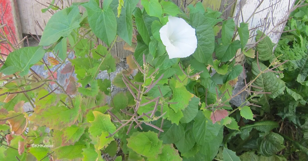 W regionach, w których mieszkałem w ciągu ostatnich 50 lat, w Kolorado i Nebrasce, znałem tylko dwa gatunki powoju, bardzo pospolity powój polny Convolvulus arvensis (blog) i znacznie rzadszy powój żywopłotowy, być może lepiej nazywany żywopłotem Calystegia sepium, oba z białymi rurkowatymi kwiatami otwartymi rano. Żywopłot jest znacznie większy – a więc całkiem piękny – i chociaż widziałem go wspinającego się po przydrożnych krzewach, nie wydawał się szczególnie zachwaszczony.