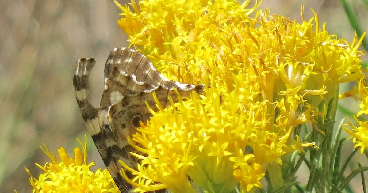 | Poobijany motyl na kwiatach szczotlichy zajęczej(Ericameria) |